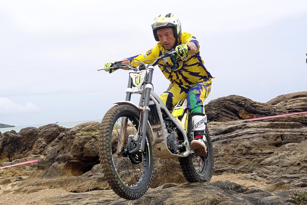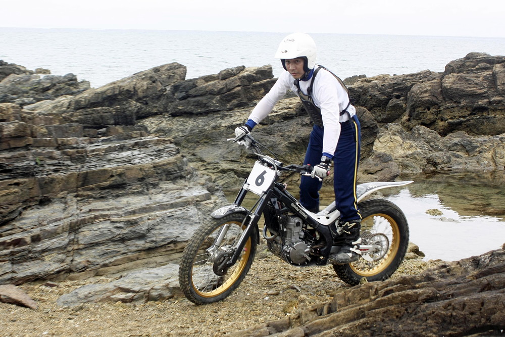 潮が引き始めてからセクション作成のため、時間がかかりスタートを遅らせて競技時間も少し短くなり6セクション2トライで始まりました。山ではなく海をバックにトライアル! バイク大会だ!