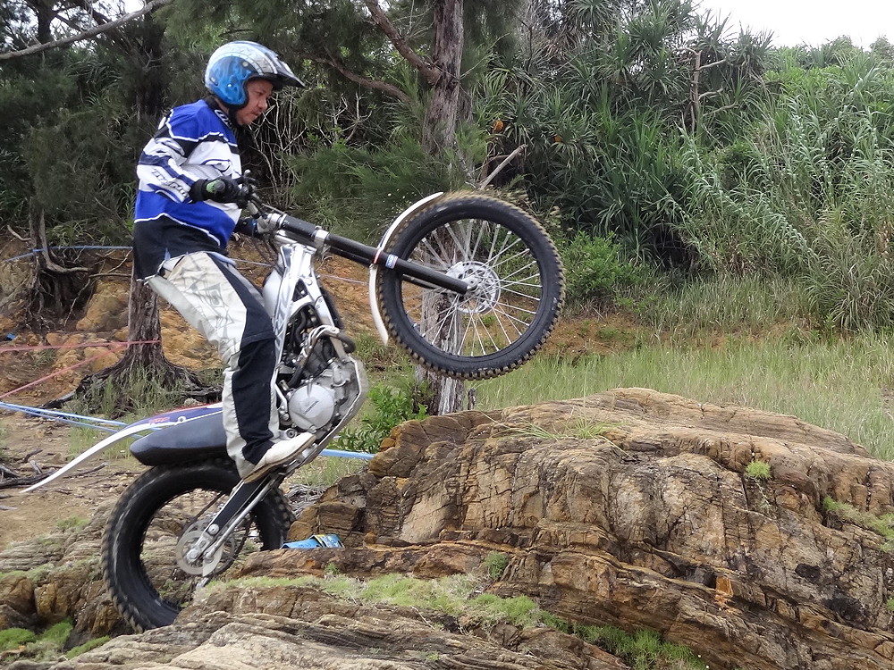 例年より1週間ほど遅めの16日に梅雨に入りした沖縄。今日は大潮。干潮13:06。潮が引いた海岸の岩場を使ったセクションで、沖縄トライアル大会第5戦 久志海岸大会が開催されました(名護市辺野古の基地の隣になる久志区の海岸です)。