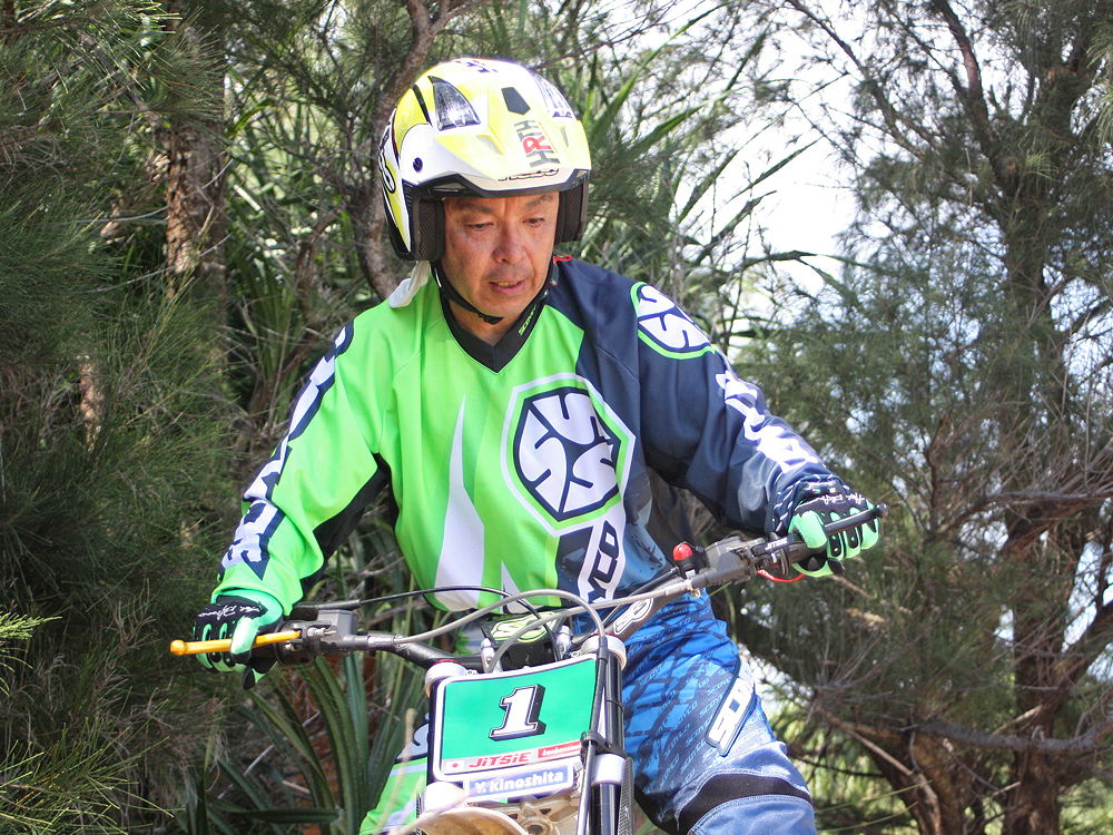 他の選手はマイペースで時間をかけてトライです。久田選手は上手に走りますが暑さのせいか走りが荒くなり減点を増やしてしまいます。知念選手は新しい夏バージョンのウェアで「涼しくなった」と力走しますが、1番と4番セクションで大転倒。3番ではスタンドが岩にかかりスプリングが外れてしまうアクシデントで減点を取ってしまいます。前大会で優勝の長浜選手は暑さにへばってクリーンが取れません。暑さに気持ちが負けたと津嘉山選手は5点を取ります。