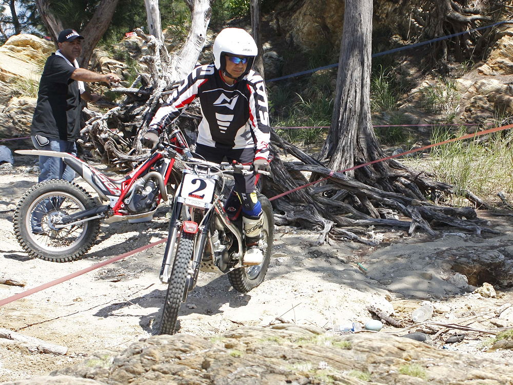 名護市の東側にある久志海岸。白い砂浜、青い空、潮が引いた砂場と岩場広がります。今日は大潮で干潮:12時40分、潮が引いて現れる岩場のセクションで沖縄トライアル大会第7戦、久志海岸大会が開催されました。朝はまだ潮が入っていたので引くのを待って急いでセクション作り、今回は5セクションの3トライで勝負です。15分遅れでスタートになりました。