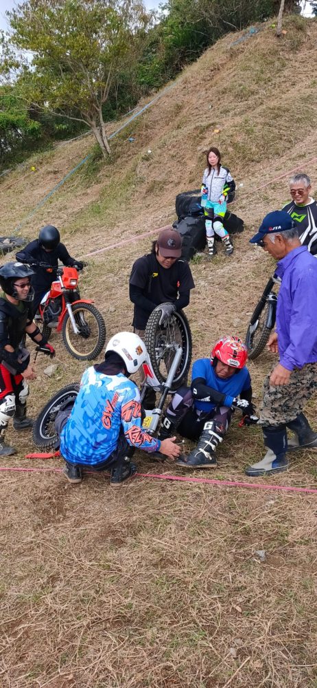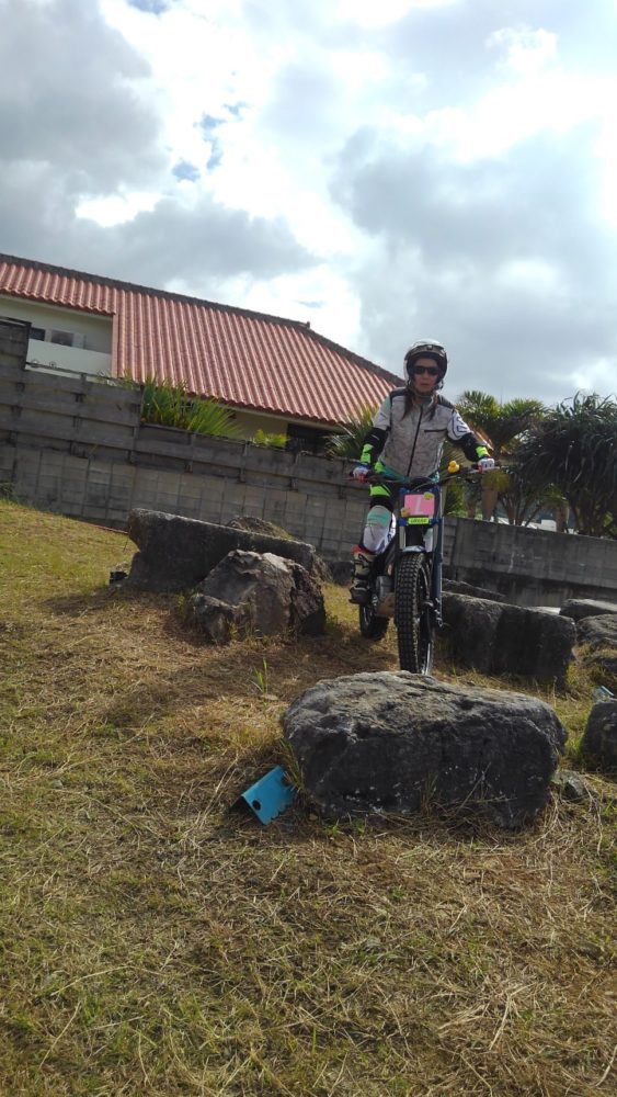 今月は、女性1名の参加でした。EMという電動トライアルマシンを駆る森選手です。一人さみしいかなと思われましたが、かえってみんなからたくさんの声援をもらいリラックスして楽しめたとのこと。それより何より、目を見張るほどの急成長!きついかなと思われたターンを難なくクリアしたりとかなりの上達ぶりが伺えます。秘密特訓してますと不敵な笑みを浮かべていました。