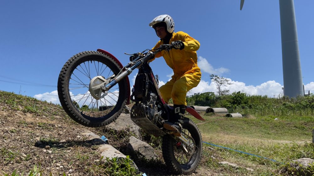 今月は、4名のライダーが参加、トライアルを始めてまだ数か月の玉代勢選手が2連勝!!。毎週休みにはがっつり練習、コースの走り方にもだいぶ慣れ素晴らしい上達ぶりです。次回好成績を納めたら昇格の予定です。2位は電動トライアルバイクのレディースライダー森選手、仕事が忙しくてあまり乗れてませんでした~としながらも、落ち着いて丁寧にマシンを操っています。1位とは僅差の2位でした。3位はホンダの名車TLM50の比嘉選手、果敢に難易度の高いステアを攻めますが惜しくも転倒、非力なマシンを操るのは難しいがそこが面白いと、いい汗をかきながら笑顔で語っていました。