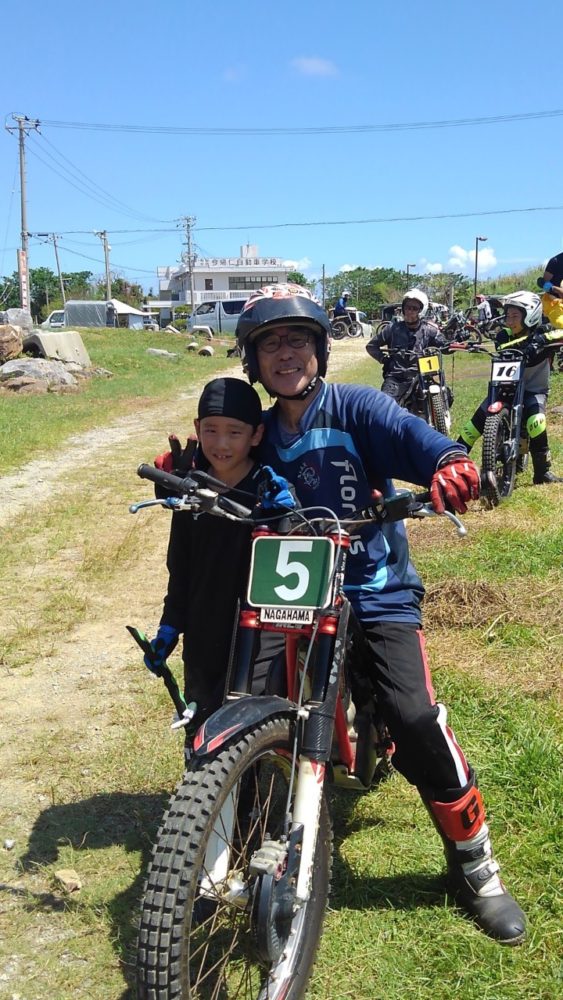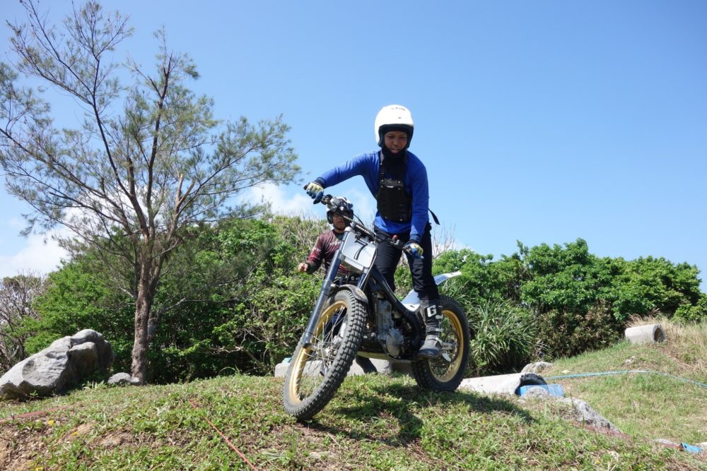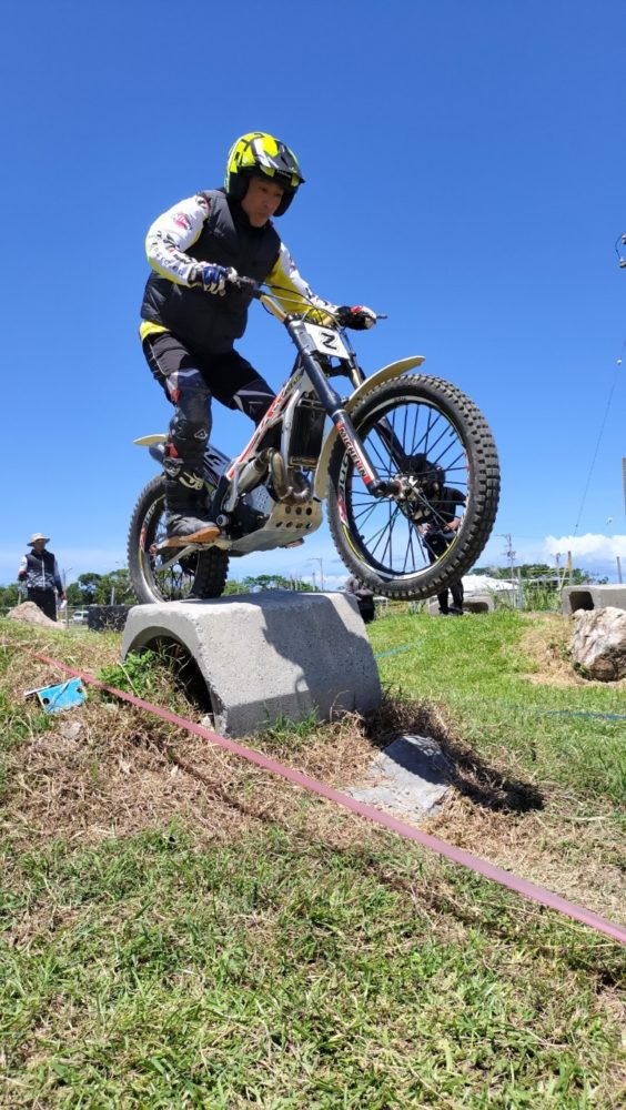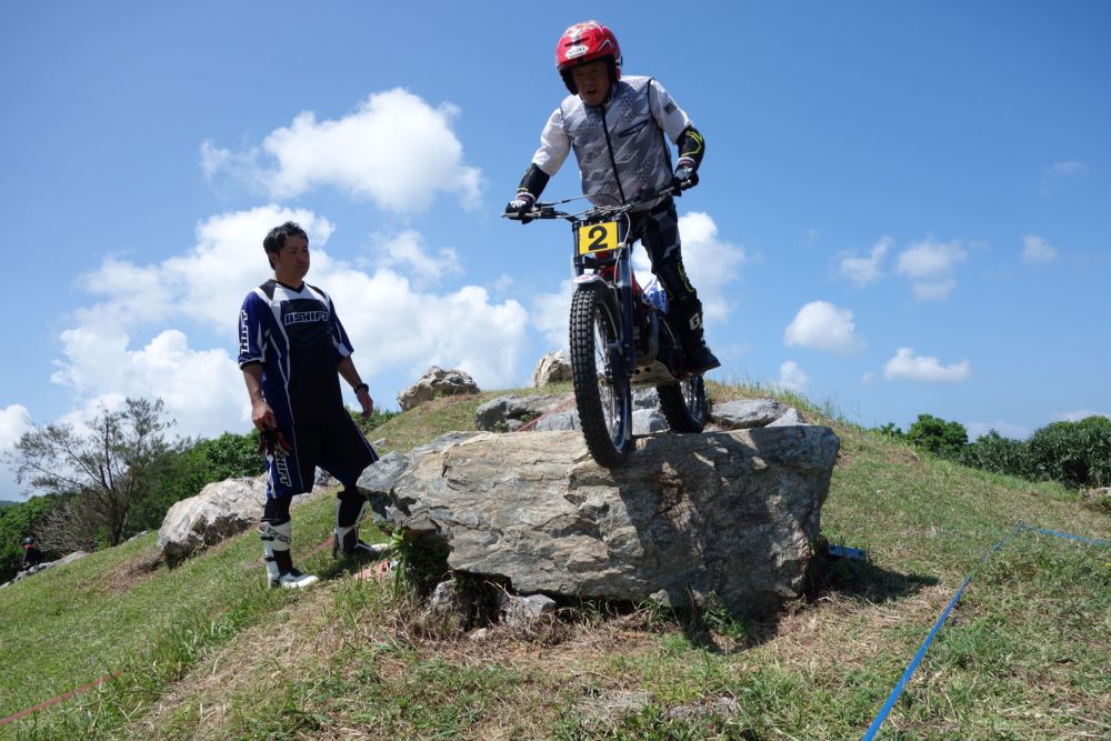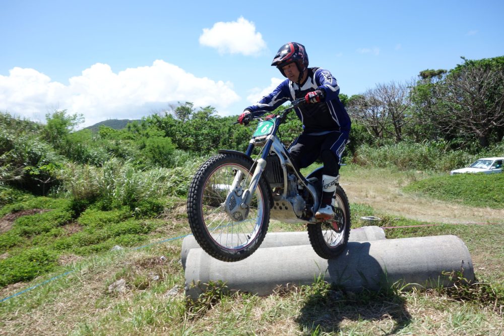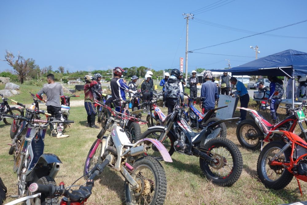 沖縄トライアル大会第8戦、国頭郡今帰仁村在、今帰仁自動車学校のすぐ隣に位置する今帰仁トライアル牧場、今月もスポーツドリンクを用意してコース長めの3セクションの3トライで設定、燦々と降り注ぐ太陽を浴びながら熱い戦いが繰り広げられました。無風状態でかなり暑く、いかに集中力を切らすことなく走ることが出来るかが勝敗を左右する大会となりました。