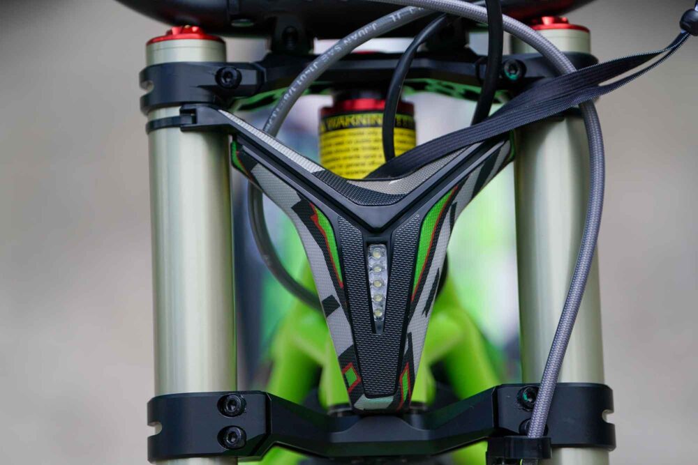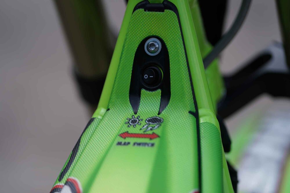 このモデルでは、バッテリーがクロスボウ製に変わっている。クロスボウはヴェルティゴのサブブランドともいっていいもので、かつては自転車も作っていた。今回はハンドルバーもクロスボウ製になっている。バッテリーは当然リチウムイオン製だ。