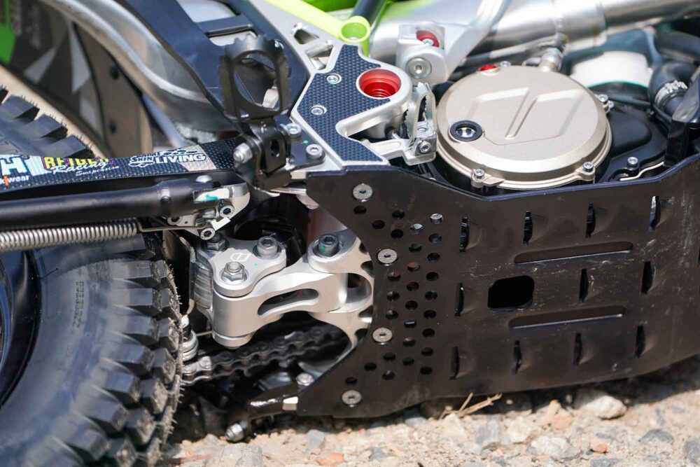 今回のモデルチェンジで最も大きいのがリンクだという。構造も変わり、削りだしからプレートで押さえるようになっている。これは軽量化に寄与しているが、落ち着きのあるライディングは、このリンクによるところが大きいようだ。リンクの変更は、サブフレームから変更になっているから、従来のリンクをつけたり、従来モデルに新型のリンクをつけるのは不可能ではないながら、なかなかの大工事となりそうだ。