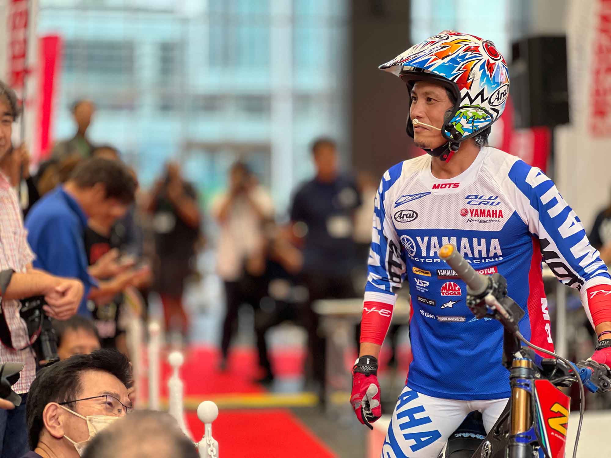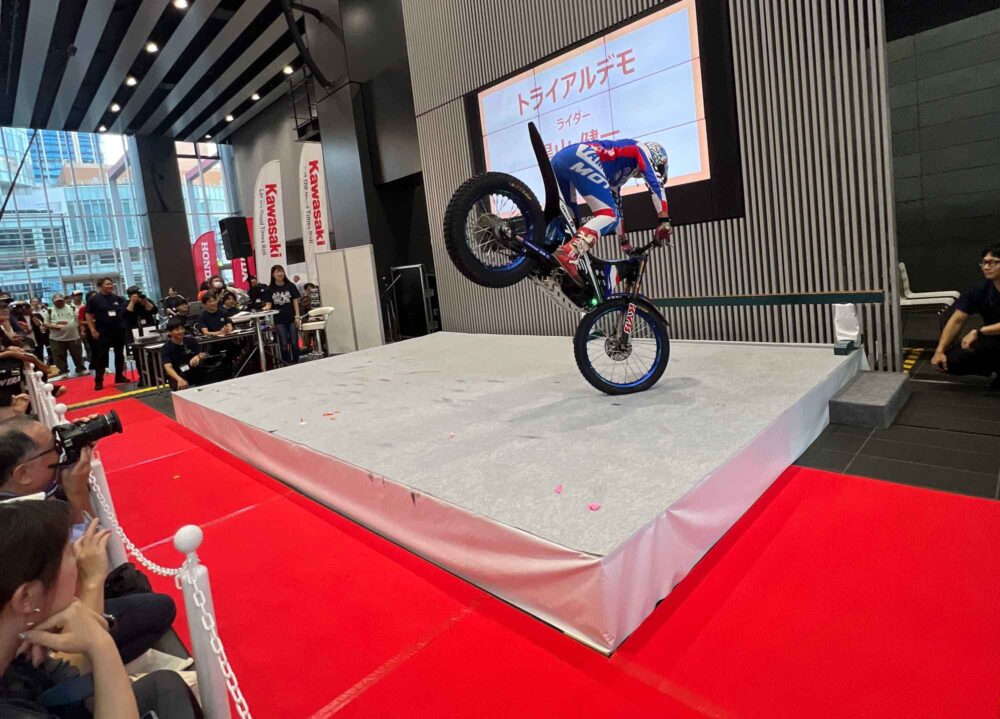 今回は第17回目の開催で、さまざまなコンテンツがあった。メインステージのトークショーは一部と二部に別れていて、どちらもそのトップバッターが黒山健一のトライアルデモンストレーションだ。とても狭い場所で、トライアル競技のこと、電動バイクTY-Eの紹介など、多数のギャグを飛ばしながらキレのいいトークとテクニックで観客を惹きつけ、場内は一気に盛り上がった。