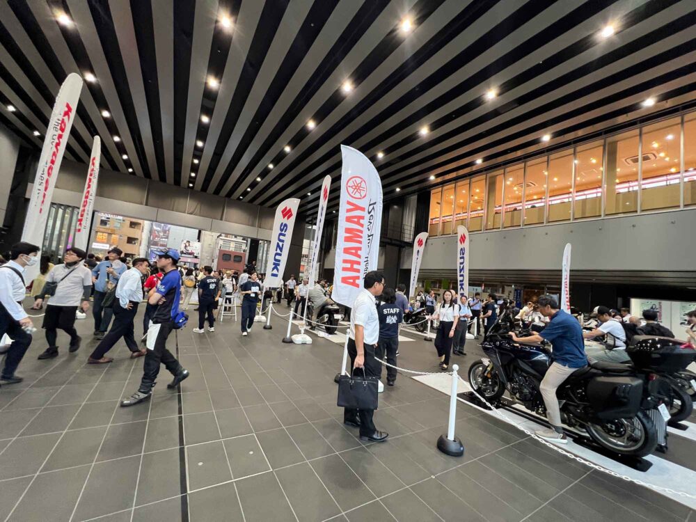 会場は東京・秋葉原駅から徒歩3分ほどの『アキバ・スクエア』。この日も猛暑日だったけど、午後2時半から夜8時までの開催はゆったり感があっていい。さらに今回の会場は、ビル2階から吹き抜けになっている半室内みたいなエリアで、雨が降っても大丈夫。オープンエリアなのにクーラーがそこそこ効いてすばらしい環境。国産メーカーの最新バイクとレース車両展示があり、俳優、バイク界のさまざまなジャンルの方々のトークショー、そしてエンディングはミュージックライブと抽選会で盛り上がった。