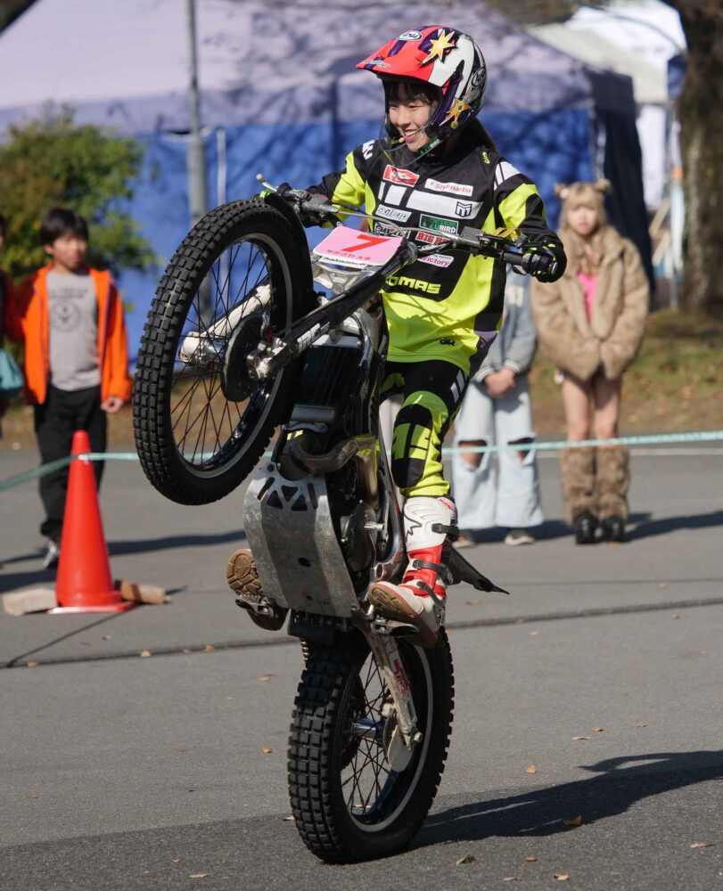 デモが始まるのはお昼前の11時25分。3人のトライアルライダーの姿があった。国際A級小野貴史選手と砂田真彦選手、そして全日本レディースライダーでもある中澤瑛真選手だ。