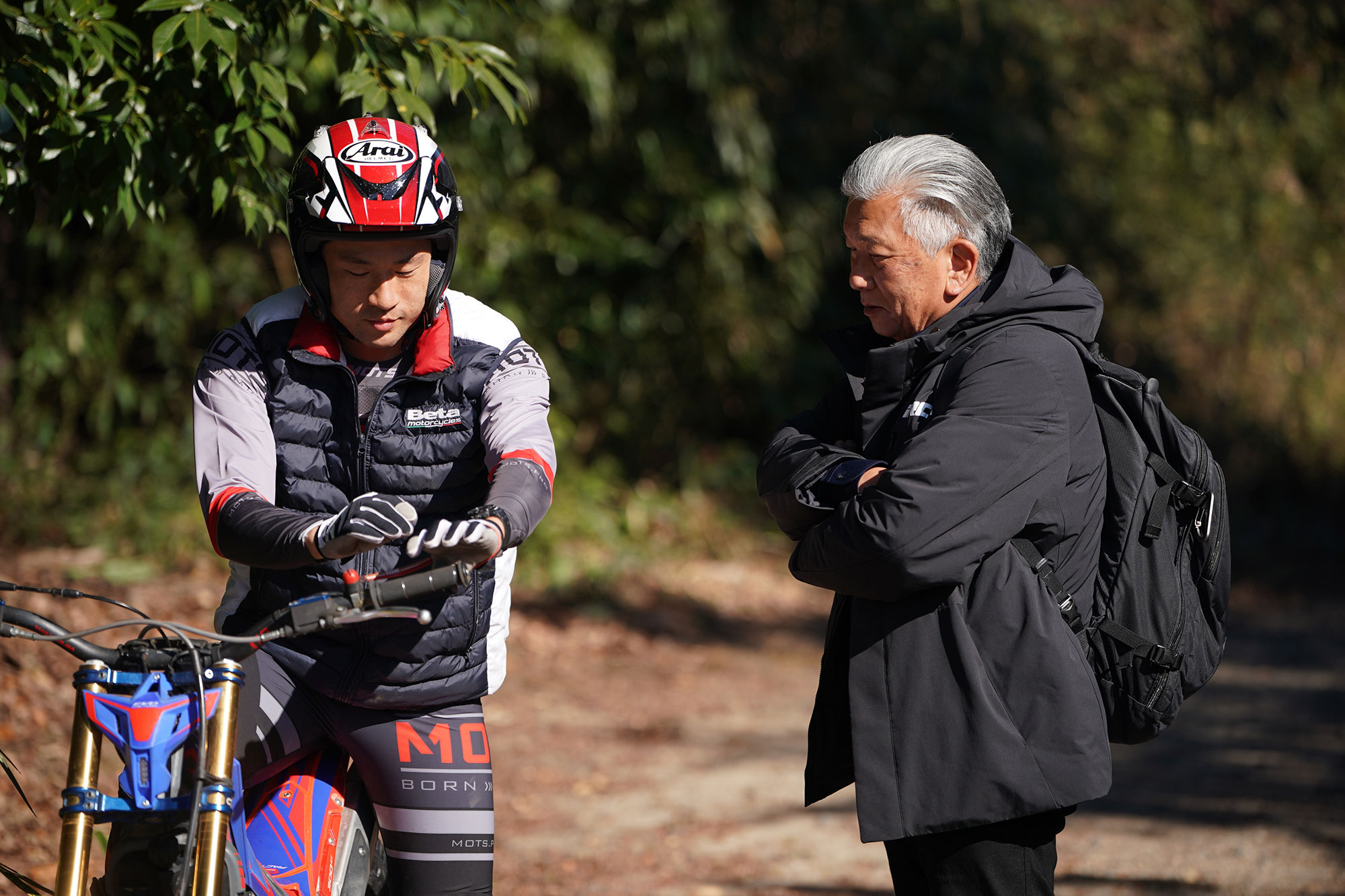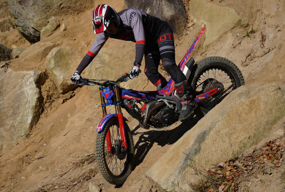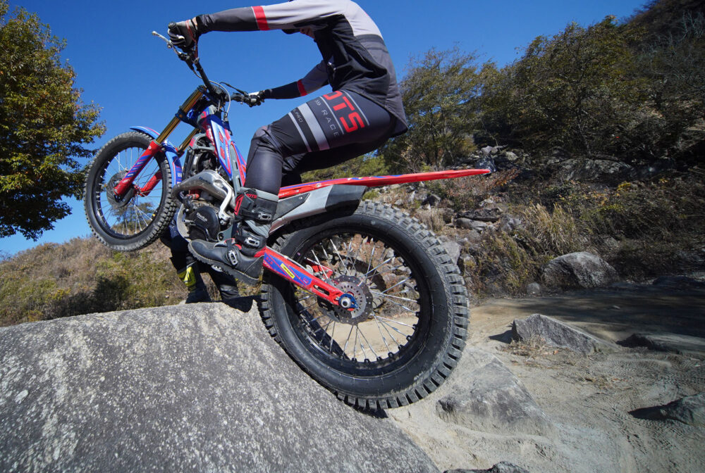 今回の試乗マシンは小川毅士選手のいつもの愛車、ベータEVO-2T FACTORY 300。フロントはTR-001を共通して使い、リヤのみzとz PLUSを履いたホイールを用意して、途中で交換した。いつもの試乗とちがって、勝手知ったるオフロードパークSHIRAIで、自分の愛車でのテストとなって、いつもよりさらに攻め込んでいるようにも見える。zの想定使用範疇をちょっと逸脱しているハードなコンディションとも思えるが、テストの一環ということでご了解ください。