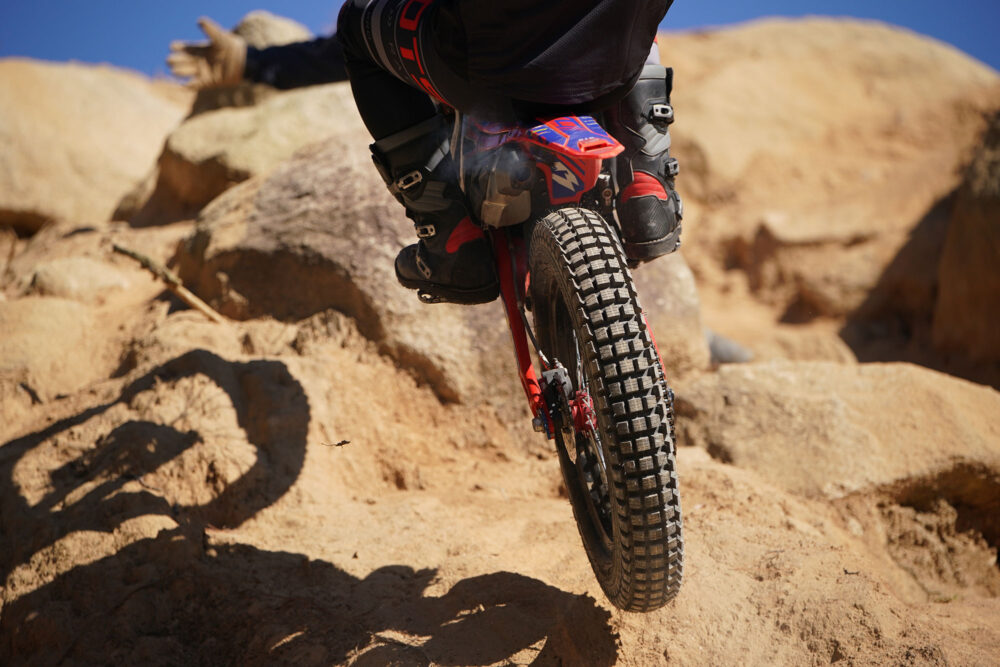 両者の差は、大方のトライアルライダーが乗り比べて理解できる差ではあると思うけど、中にはさっぱりわからない人もいると思う。そういう人は、zが無二の選択になることだろう。たとえ、両方を乗り比べてその差にまったく気がつけなくても、タイヤが自分でアクションしてくれるzには、きっとライディングを助けてもらえるにちがいない。