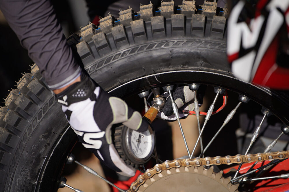 空気圧は、中野さんの指示に合わせて、フロント4.0、リヤ3.0とした。しばらく乗っていたらよれる印象があったので、空気圧をチェックしてみると、3.6まで上がっていた。空気圧を上げればタイヤの剛性は上がるかとおもいきや、逆によれてきた。中野さんによると、トライアルのような低圧での使用を前提とすると、空気圧が高いから固い、低いと柔らかい、という評価にはつながらないこともあるそうで、リヤは3.5までの間で自分のベストエアを求めていくのがいいようだ。灰塚ダムの全日本では、3.0より低い空気圧が、IBライダーの間では高評価だったという。
