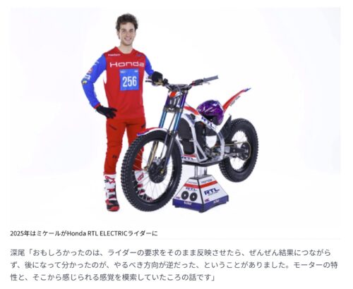 この取材のあと、HondaからはRTL ELECTRICとミケール・ジェラベルトが2026年にGPクラスに舞台を移して参戦するという発表があった。アウトドアのトライアルGPに先がけて、2月のバルセロナ大会では、ワイルドカードのスポット参戦ながら、RTL ELECTRICのXトライアル初参戦というトピックもあった。