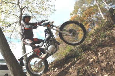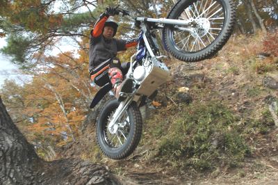 125Fは、排気量が足りないからいけないというところもそんなに多くはないのだが(もちろん、パワーまかせの一部のセクションは歯が立たない)、排気量を増すことで、走破力の向上というより、乗り味は劇的に変化する。125の排気量に対する漠然とした不安感がなくなって、ぐっと安心感が増してくる。極低速のピックアップも、安心してスロットルを開けられるようになっている。125ccという排気量ゆえ、登録した時の保険や税金が安いのは魅力だが、トライアルセクションに入れば、こちらのほうが適しているのはまちがいない。