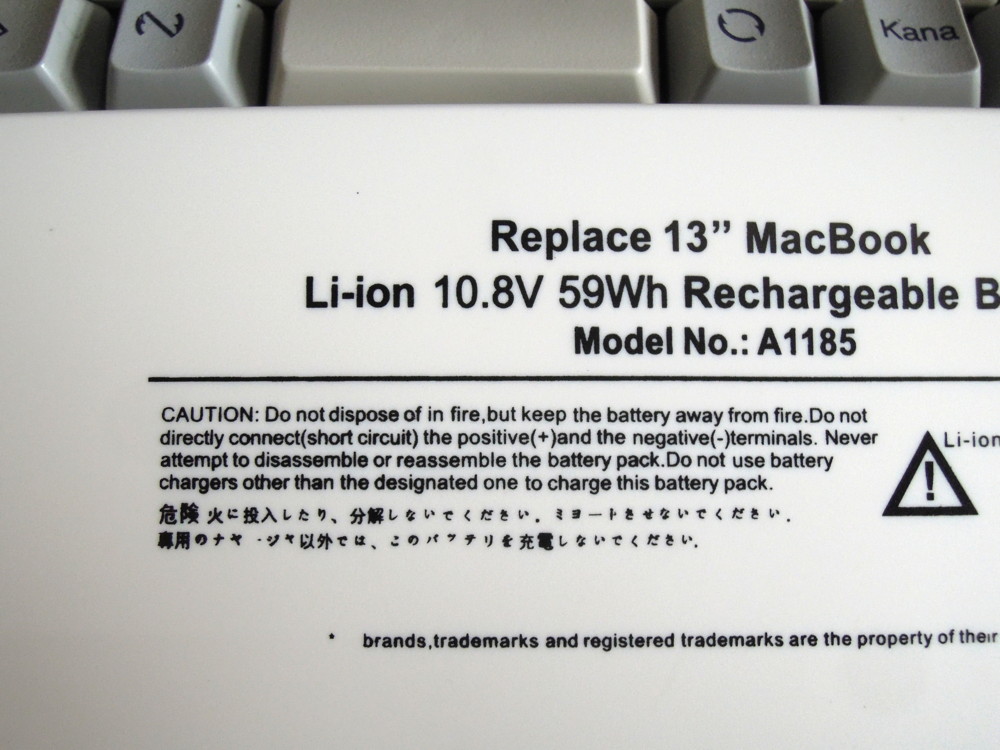 で、届きました。70%ほど充電状態で届くという先人のいう通りの状態だったので少し安心。まだ充電中だけど、とりあえず、バッテリーに表示してある注意書きがすごい。