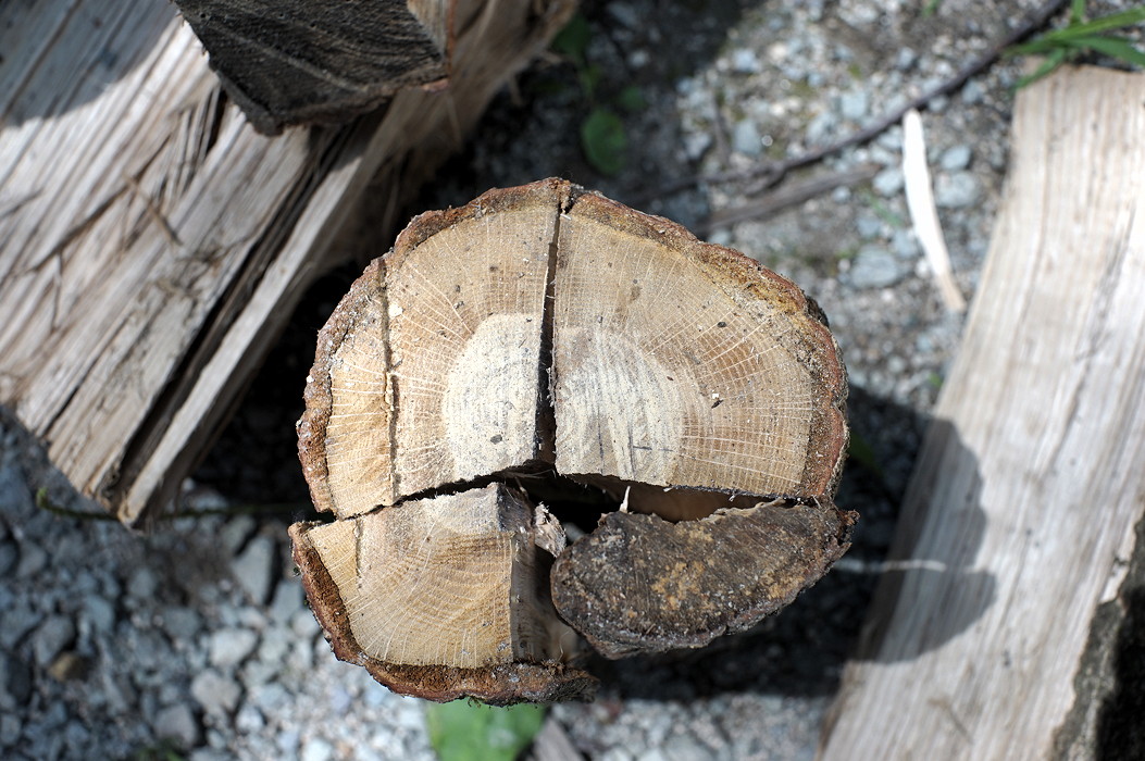 ついにピースが合いました。こんな要領で、薪棚に積んであるすべての薪を合わせていくと、たいへんな達成感を得ることができます。ただしぴったりと合わせたまま薪棚に戻すと、薪が乾きにくいと思われるので、薪棚に戻すときにはまた割れた状態に戻しておきましょう。