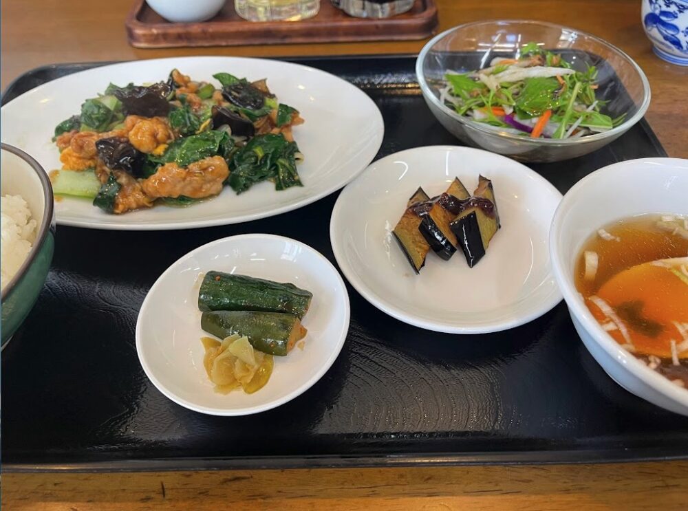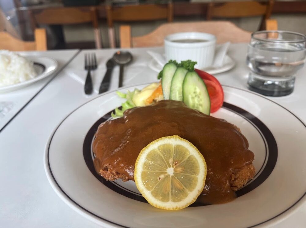 このお店ではポークソテーを頼むことが多くて、たまにはちがうものをと思って頼んでみました。キュウリが入ったスープがくせになってきた。そういえば、食事にみそ汁でなくスープがついてくるお店はこのあたりでは貴重です。味は濃いめ。(2025年9月)
