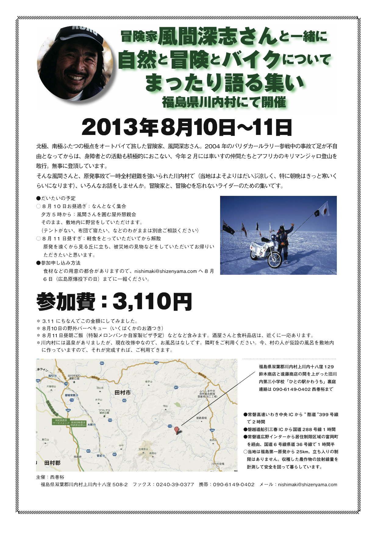 実は風間さんとは、2011年の5月にオフロードバイクのイベントをやろうよと話をしていたんだけど、もちろんお流れになった。その後風間さんは、被災地の支援に走り回ったり、ごく近所を通過したりしていたんだけど、うちの村には寄れず。