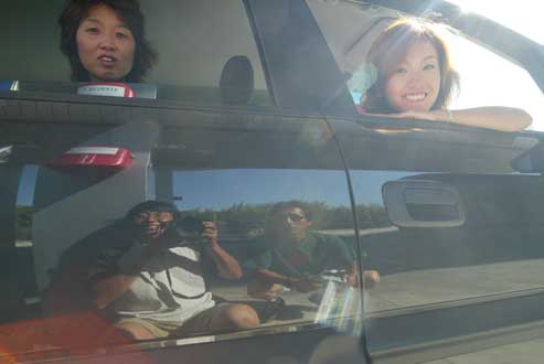 藤波家では取材をしたり近所を散歩したり、カベスタニーが得意だというゲームをしたり(2戦2敗しました。くやしい)海の街にお食事にでたりしました。写真は、ガソリンスタンドでご主人さまが給油している間に、愛車のオペルを使って記念写真におさまるご主人さま以外の4人。カメラ持ってるやつが一番お呼びでないですね。