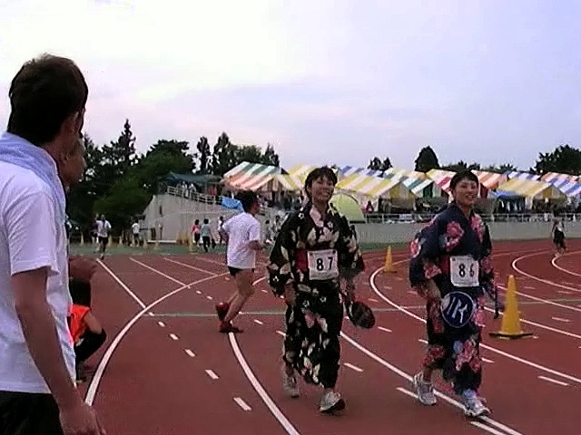 中には、スーツとかセーラー服着て走ってるやつとか、赤ふん一丁のやつとか際物もいっぱいいる。もちろんまじめに走っている人もいっぱいいる。セーラー服が遅いかというと、これが全速力で走っていたりする。走るほうに自信がなければ、セーラー服なんて着て走れるわけがないのだ。速いほうは際限がなくて、コニカミノルタが冠スポンサーなんで、コニカミノルタの実業団チームも走っている。こいつらに限らず、ちゃんと走っている人たちは性別年齢問わず、とんでもなく速い。