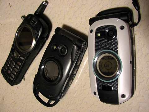 真ん中の黒いのは、その防水携帯電話の後継機として登場したもので、メーカーは同じくカシオ。前のやつにはカメラがなかった。携帯で写真なんか撮る趣味はこれっぽっちもないのだけど、携帯電話で自然山のWEBに速報を送るようになると、雨の日でも電話機だけ持っていれば、最低限のお仕事ができるってのが魅力に思えてきた。防水の携帯電話も防水のカメラも少ないけど、防水のコンピュータはないに等しい。雨の日にメールを送るとなると、多少うちづらくたっても、防水携帯電話は心強い道具になるってもんだ。