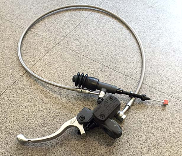 TY125-4Tのノーマル車両はクラッチケーブル仕様となるが、今回の特別仕様車、油圧クラッチキットを装着することで、従来のワイヤーコントロールではなしえない、ハンドル切れ角に関係なくスムーズにクラッチコントロールを仕様でトライアルを楽しめることになる。