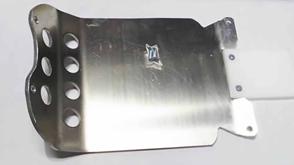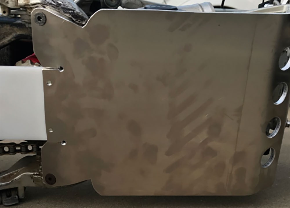 TRSの純正アンダーガードは、幅が狭く左右のカバーやフレームを打ちやすいです。TRS用スーパーアンダーガードは、ワイドに設計され、左右のカバーやフレームを保護します。ガードを引っ掛ける「亀」状態の安定感も抜群。6mm厚の強化ガードなので車体剛性もUPします。リンクをしっかりガードする、リンクプロテクター付きです。